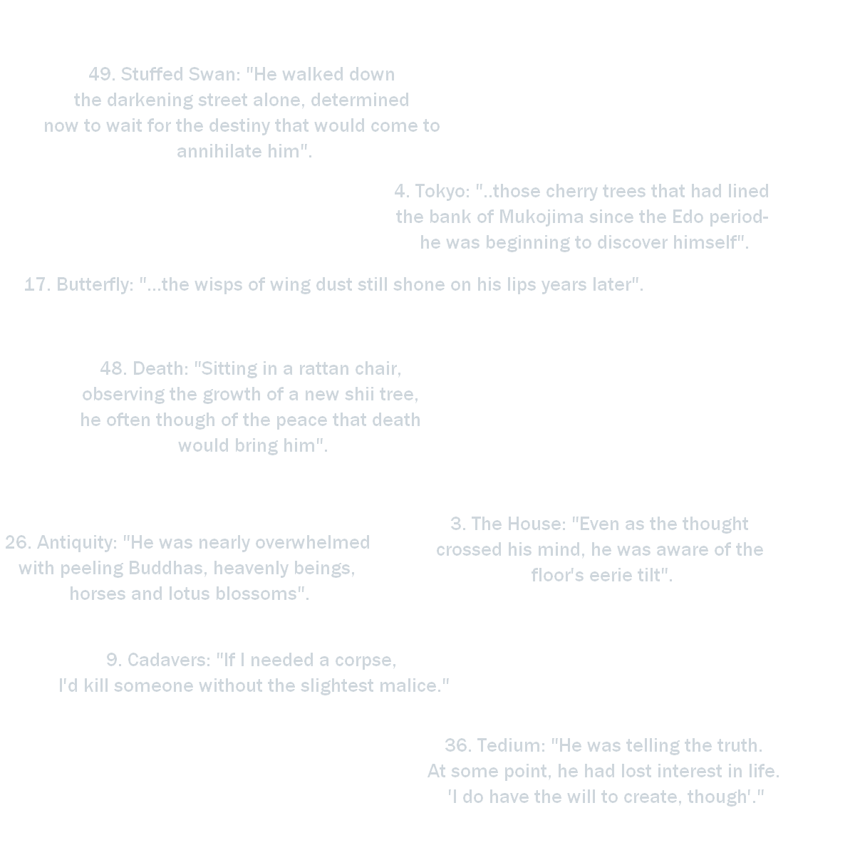 As a sort of microcosm for the book as a whole, this chapter is split into many different stories, in this case, 51. Some are so small it'd be okay to call them poetry, and even the big ones aren't longer than a page. Each has a title of a single word, every time.